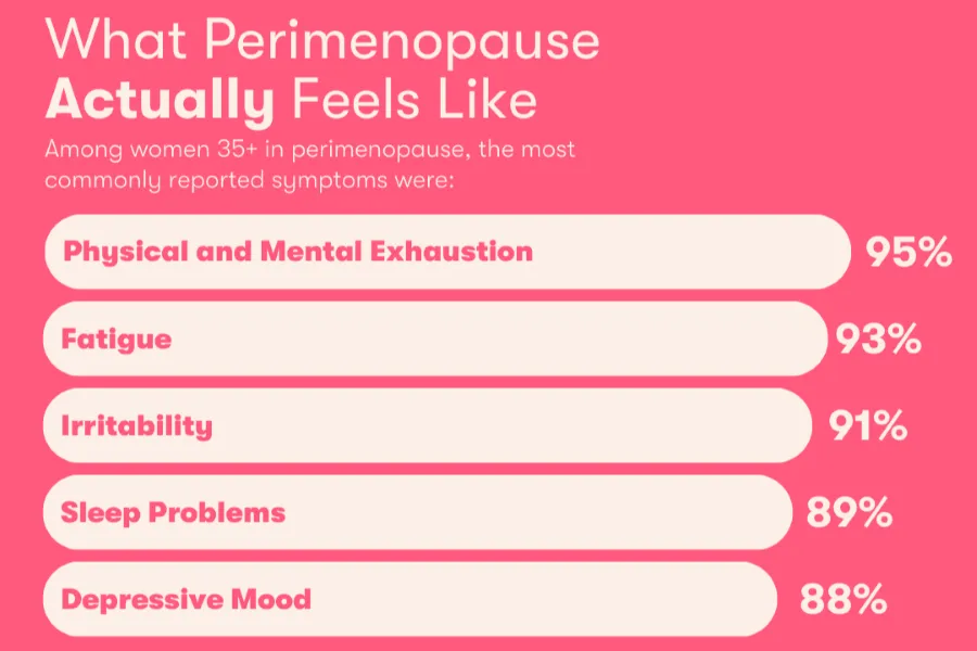 Women who reported being in perimenopause, the top five symptoms were physical and mental exhaustion (95%), fatigue (93%), irritability (91%), sleep problems (89%), and depressive mood (88%).
